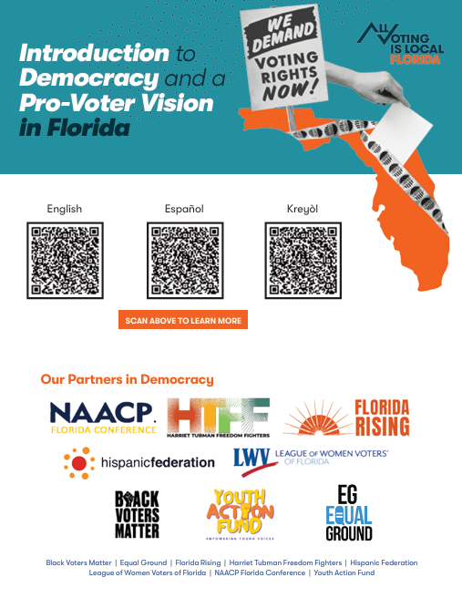 At All Voting is Local we're proud to share our 2025 Introduction to Democracy and a Pro-Voter Vision guides in partnership with Black Voters Matter, Equal Ground Education Fund, Florida Rising Together, Harriet Tubman Freedom Fighters, Hispanic Federation, League of Women Voters of Florida, NAACP Florida Conference and Youth Action Fund.