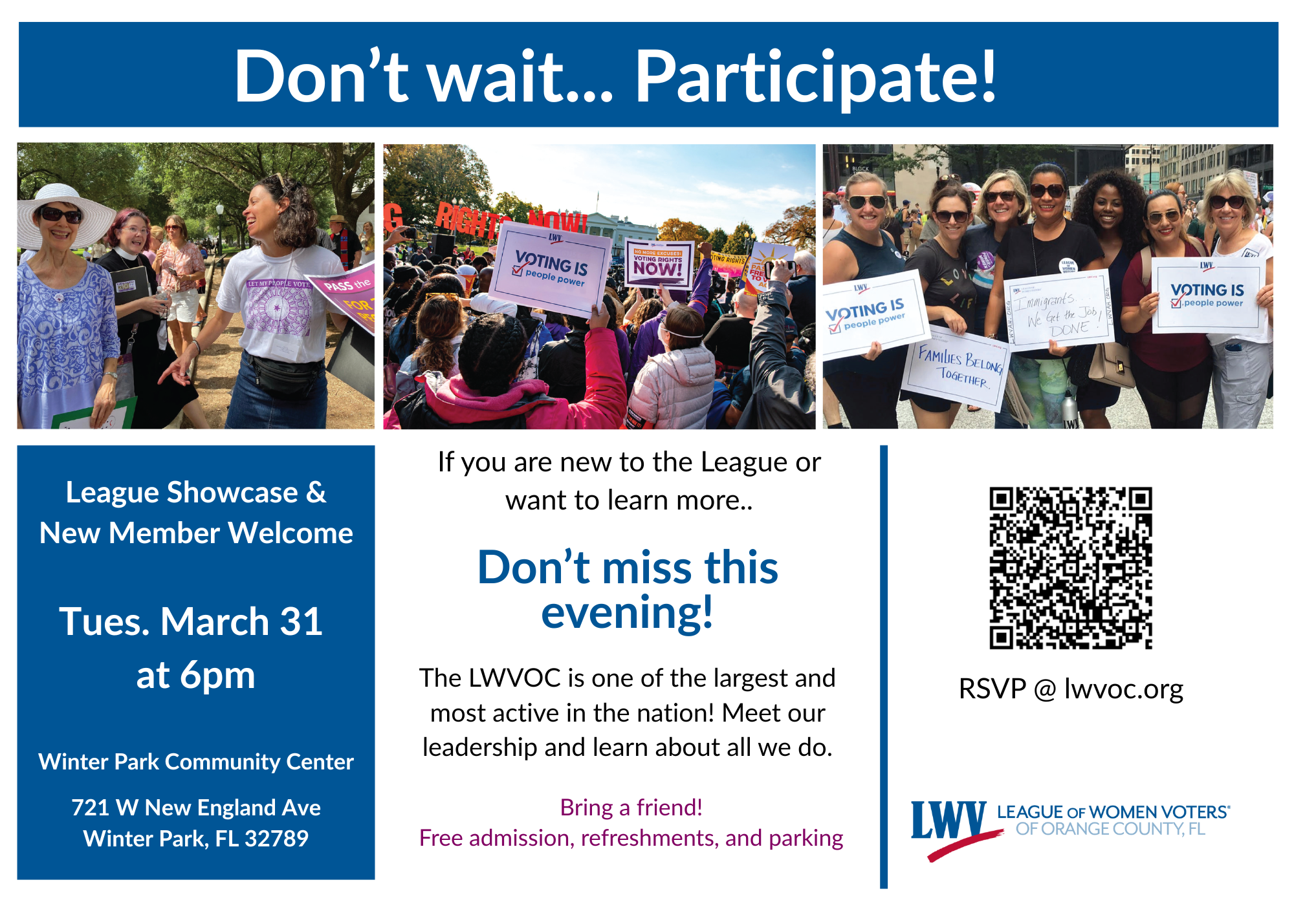 The League of Women Voters of Orange County is one of the largest single-county Leagues in the nation. Come enjoy wine, refreshments, and lively conversation as you meet our leaders and learn more about the impact we’re making locally.