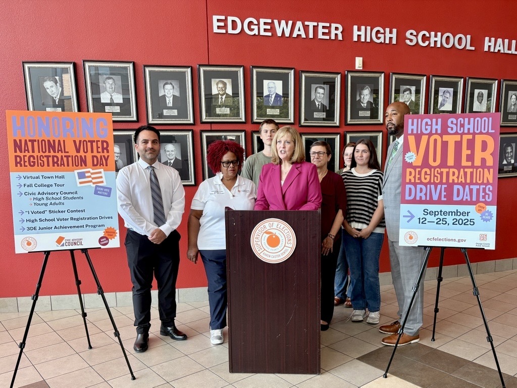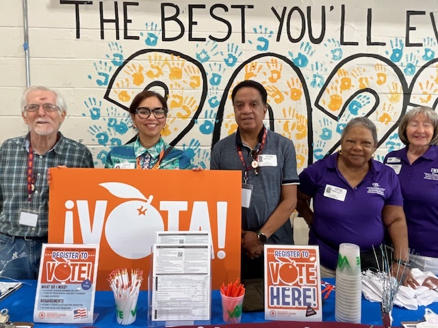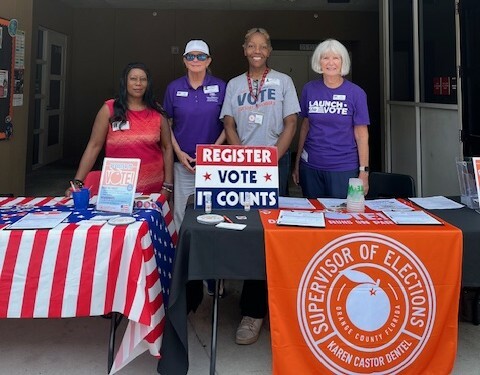 | On Constitution Day at Cypress High School: Linda Dalton and Betty Saulpaugh with Vera and Meisha from the SOE |  | LWVOC Co-President Rev. Kathy Schmitz was at the launch of the new Civic Advisory Council from the Orange County FL Supervisor of Elections. Also on hand was Ricardo Negro-Almovodar from All Voting is Local and a participant in this month's Hot Topics program celebrating Hispanic Heritage Month. | | |