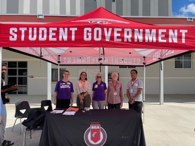 Shown below L-R: at Keiser University at their Constitution Day celebration, Leila Allen & Mary Montanus; at Boone HS with SOE reps, Marsha Davis & Trudy Boston | | Shown above on Nat'l Registration Day at EAST RIVER HS L-R: Jennifer Willman and Melinda Wright with SOE staff |  | Shown above on Nat'l Registration Day at JONES HS L-R: Marsha Davis, Toni Pollock, Betty Saulpaugh, Marbri Pereira (SOE), Jane Hursh, Virginia Meany, Shan Rose, Gaye Reese, Mary Montanus, Gina Hall, Sunshine Grund | | |
