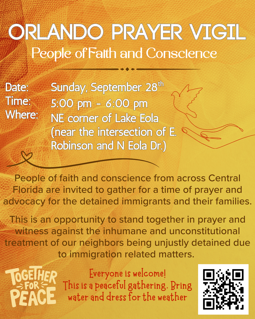 |  | | The Global Peace Film Fest Sept. 16-21 will host 20 films with 13 of them directed by women. LWVOC members/supporters can use a unique code L3@wv for online ticket sales. With the use of this code, both get 10% off each ticket AND GPFF will donate $4 from each ticket to LWVOC. |  | The Orlando Prayer Vigil is scheduled for 9/28/25 at 5pm at the northeast corner of Lake Eola, near the Pagoda.