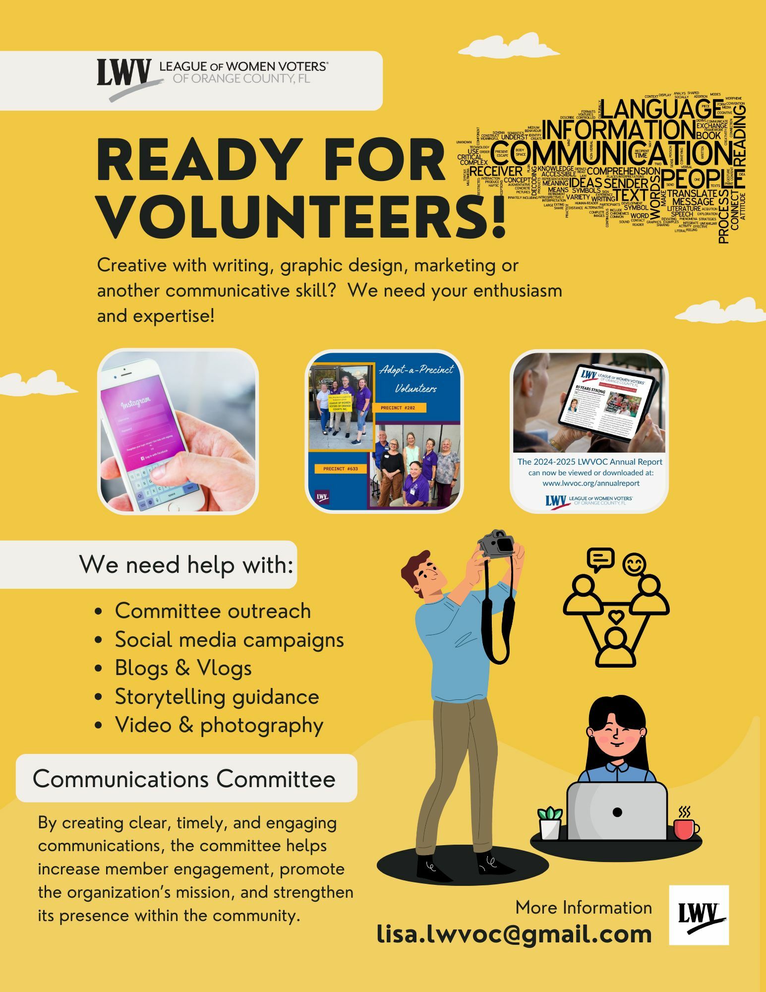 This position will support the operations of our local league by making timely and accurate membership and other information available to leaders and members. It requires comfort with technology and a willingness to learn new systems. Let us know if this might be one of the ways you Empower Voters and Defend Democracy. For a full position description link, contact president@lwvoc.org. | | |