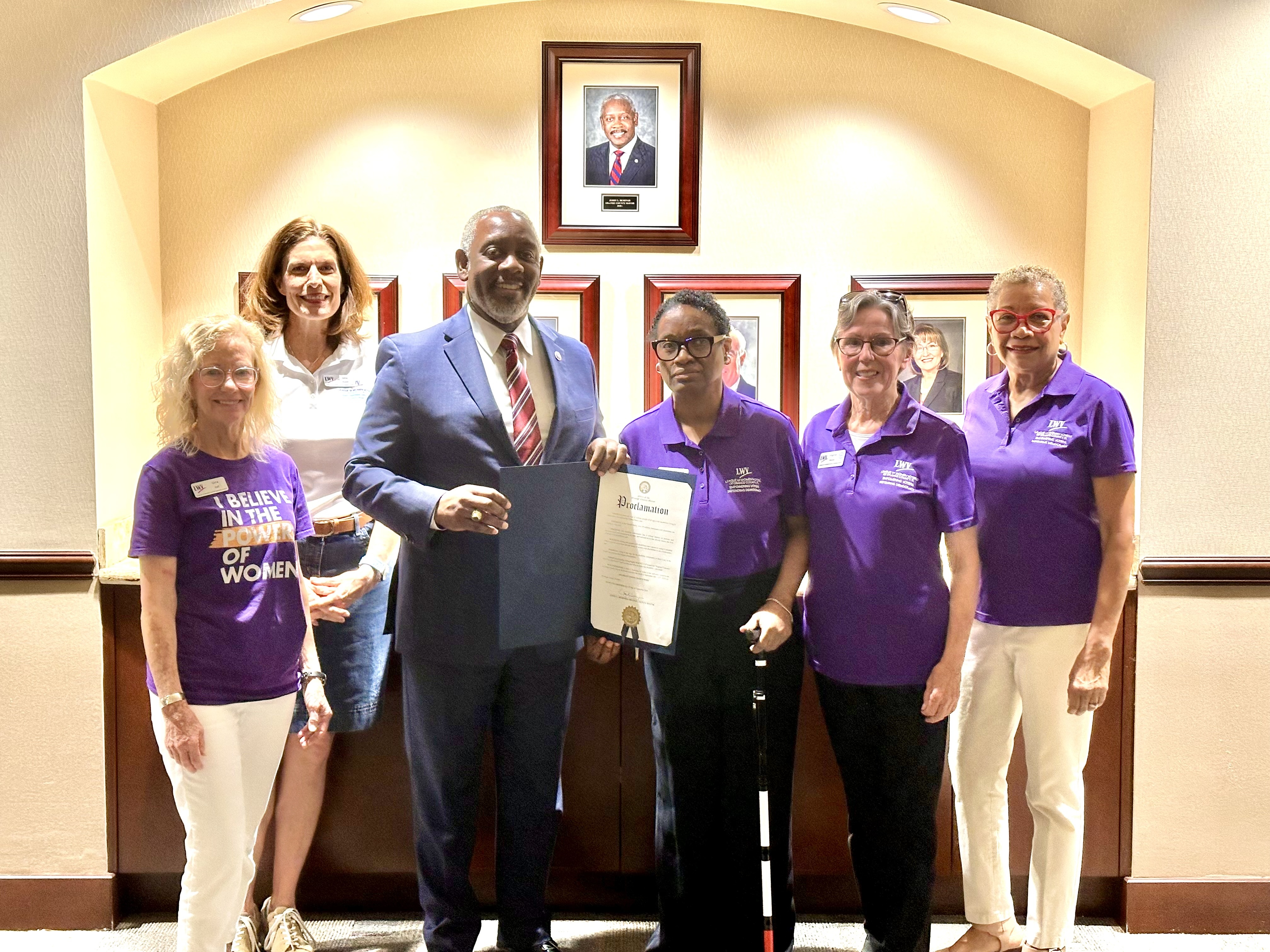 | Orange County Mayor Jerry Demings presented a proclamation in recognition of National Disability Awareness Week to Leaguers, l-r: Voter Services Co-chair Gina Hall, Co-president Jane Hursh, DEIA Co-chairs Marilyn Baldwin & Virginia Meany, and 1st VP Lee Rambeau Kemp