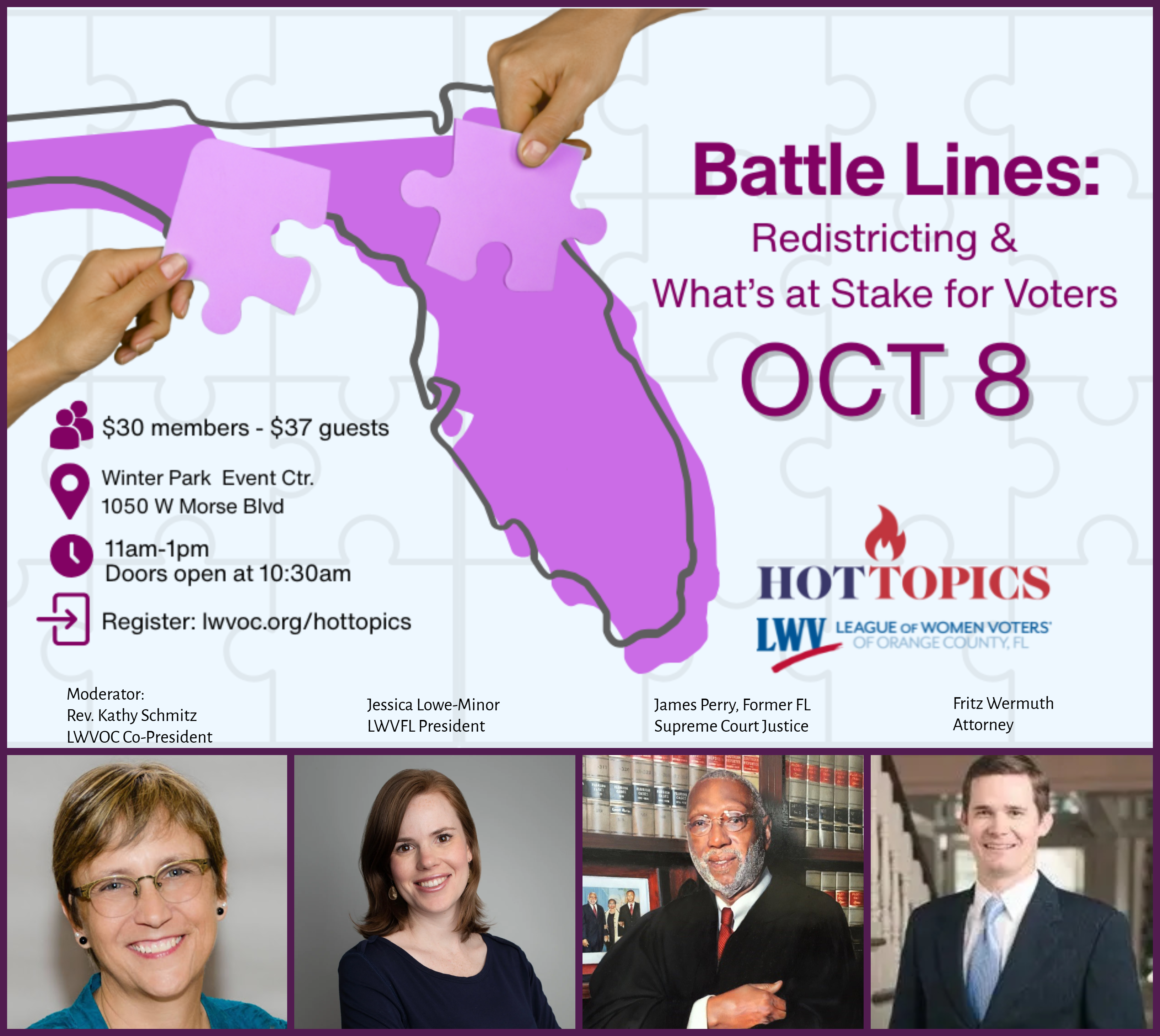|  | The moderator is the Rev. Kathy Schmitz, president of the League of Women Voters of Orange County. Panelists include Jessica Lowe-Minor, the youngest woman elected to lead the state League, former Florida Supreme Court Justice James Perry, who ruled in the Fair Districts case, and Fritz Wermuth, an attorney with King, Blackwell, Zehnder & Wermuth, who also represented plaintiffs in the case.