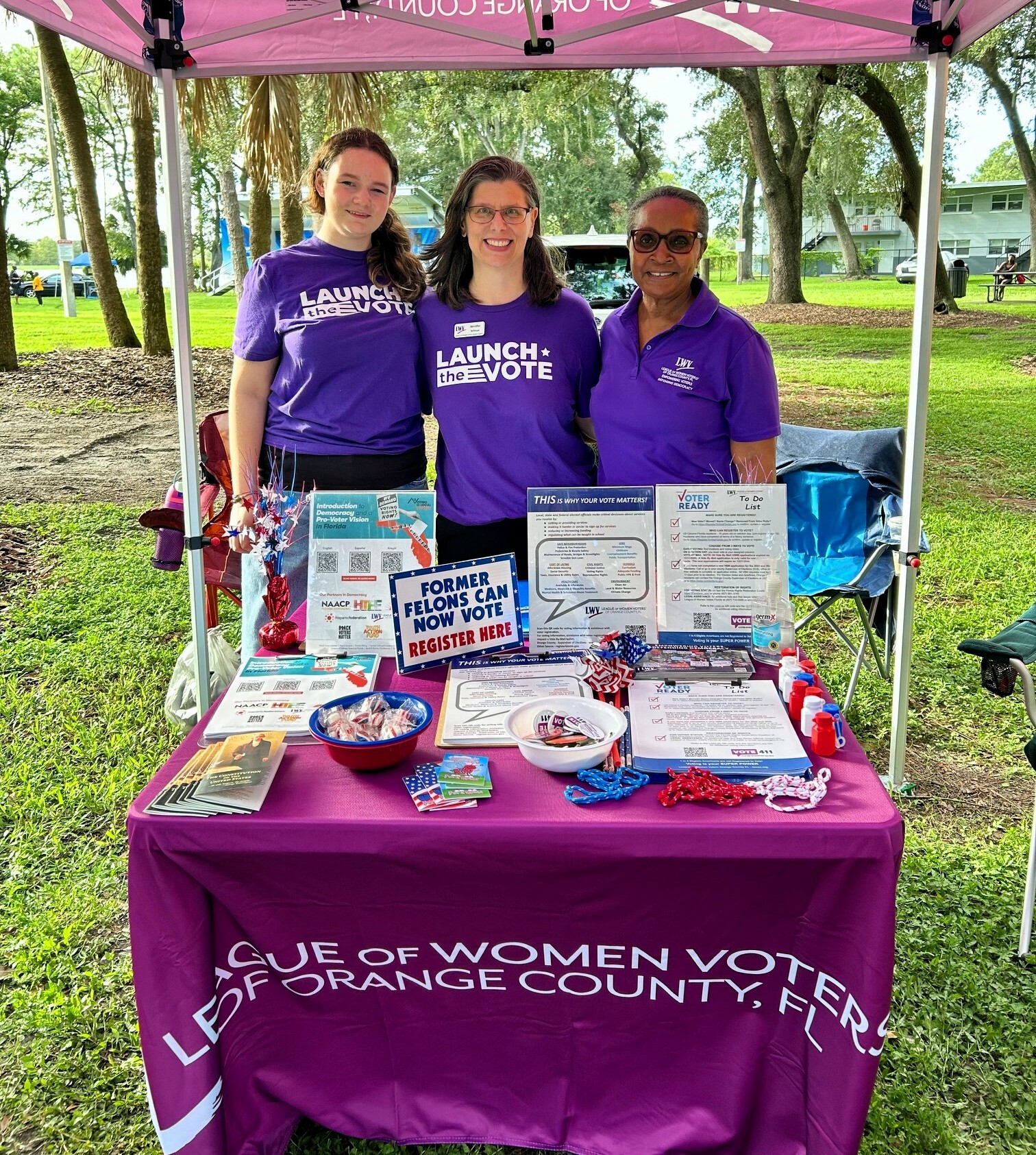 This is the role of the Members Services Committee for over 800 members of LWV Orange County. We are seeking volunteers for this committee in both support and leadership roles. Contact: Pat Grierson or Barbara Knapp | We are getting A LOT of requests for tabling at local events and need VOLUNTEERS! Check out the information below to sign up and help us empower voters. Visit Volunteering Opportunities often as it is updated regularly. Shown below l-r: new members Audrey Mills and Jennifer Willman, with longtime Leaguer Saudi Ellis performing voter outreach at Lizzie Rodgers Park in Orlando for National Night Out. The Lake Sunset Neighborhood Association has invited us to participate for three years in a row. It was a fun, family event with a record attendance. Our new pocket constitution giveaway was a great hit with the public. Our volunteers are priceless and this was recent HS graduate Audrey’s first event! Thanks to her Dad for bringing her and helping us setup and breakdown the tent. |  |