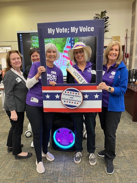 We also had a successful collection of food and toys for Hope CommUnity Center. If you were unable to attend but would like to contribute, follow this link as we will NOT be having the toy collection at the holiday party. Volunteers in photo below l-r: Luis Rosas, Yesnia Tavera, (Youth Empowerment Coordinator), Jill Heroux, Silvia Ruiz Villanueva (Youth Empowerment Lead) Susan Sussman, Paul Heroux | | | The Voter Services teams are still out at the high schools. Shown below at Evans HS: left-Tristan Dasse, UCF student and member of LWV-UCF; right L-R: Patricia O’Neill, Nancy Jo Mannix, Betty Saulpaugh, Mary Montanus, Terry Osborne, Not pictured, first shift: Melinda Wright, Huni Hoskins, Peggy Higgins