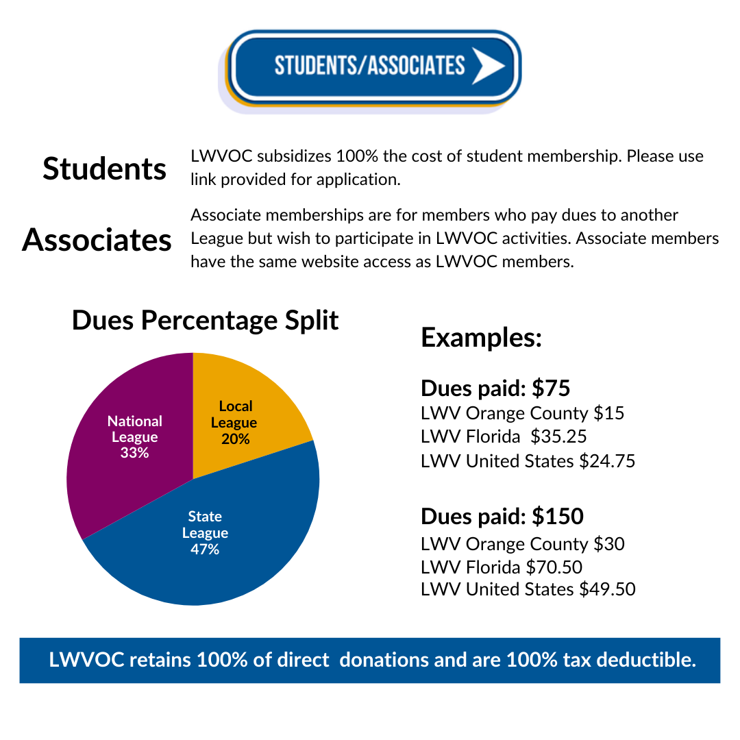 Recommended dues are $75 Members have the option to pay more or pay less with a minimum of $20. Dues are split between the national, state, and local leagues with the local League share of 20% Tax Deductibility Only the 20% that goes to the local league is deductible and members cannot pay dues from Donor-Advised Funds or other accounts that must go entirely to the 501(c)3. Additional Member A member may join or renew on behalf of another member and they can indicate that they live in a household. This allows us to link them in the LWVOC database. When adding an additional member, the dues will be the same for both members; it will double the first membership dues amount. We recommend that you decide what you want to pay for both and split it. Auto-Renew is available; memberships renew on the anniversary of your joining and you are sent advance notice of the charge. This can be changed at any time.